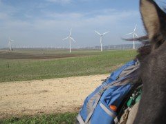For Leon I found a place behind a house in a field with thisless. Todays trip started in Facinas of which the letter C was changed into a G. The track was all flat. It didn’t take long before todays goal Medina Sidonia was visible at the horizon. Many modern windmills, hundreds of storks. So after all it seemed better that sister Francien didn’t join my two brothers and me to Spain. I guess she can stand one stork, but hundreds? In the afternoon temperatures went up to almost 30 degrees C, not a bit of shadow, but fortunately a strong cooling wind. The cap I got from my brother Jack often was blown off my head. Difficult to get it back leading a dog in one hand and a horse in the other one. Most of the time I let Tosca run around freely, so she got the chance to shabby herself in the few remaining pools on the road. One pool was crowded with turtles. Thirsty. From brother Michiel I had gotten a bottle of coca cola. Quickly I swallowed the first sip of coke. Wow, disgusting! It proved to be the petrol bottle for my coocking set. I dove to the ditch in which Tosca was jumping, swallowed some of the watery dirt and wondered wether I would get sick of a burnt gut or of an intoxication diarrea. Thinking of fire eaters and petrol addicts I eased my mind thinking that they don’t die right away. After my gut extinguishing manoevre Tosca peed in the same water. I hoped that dogs before ad not done the same.