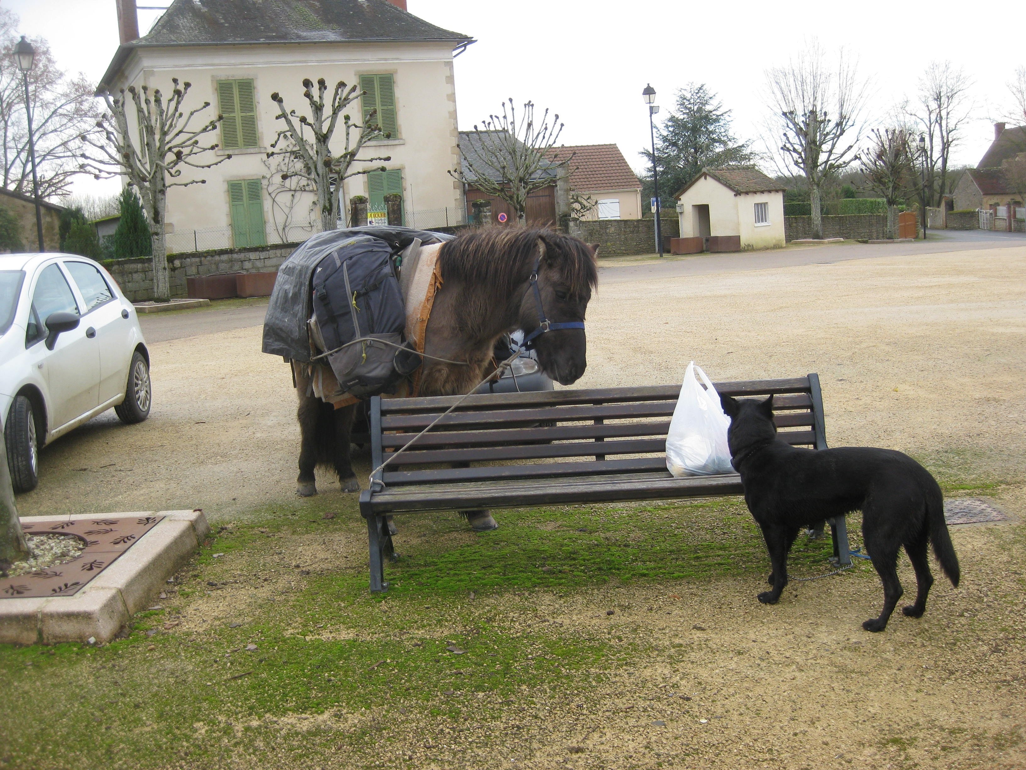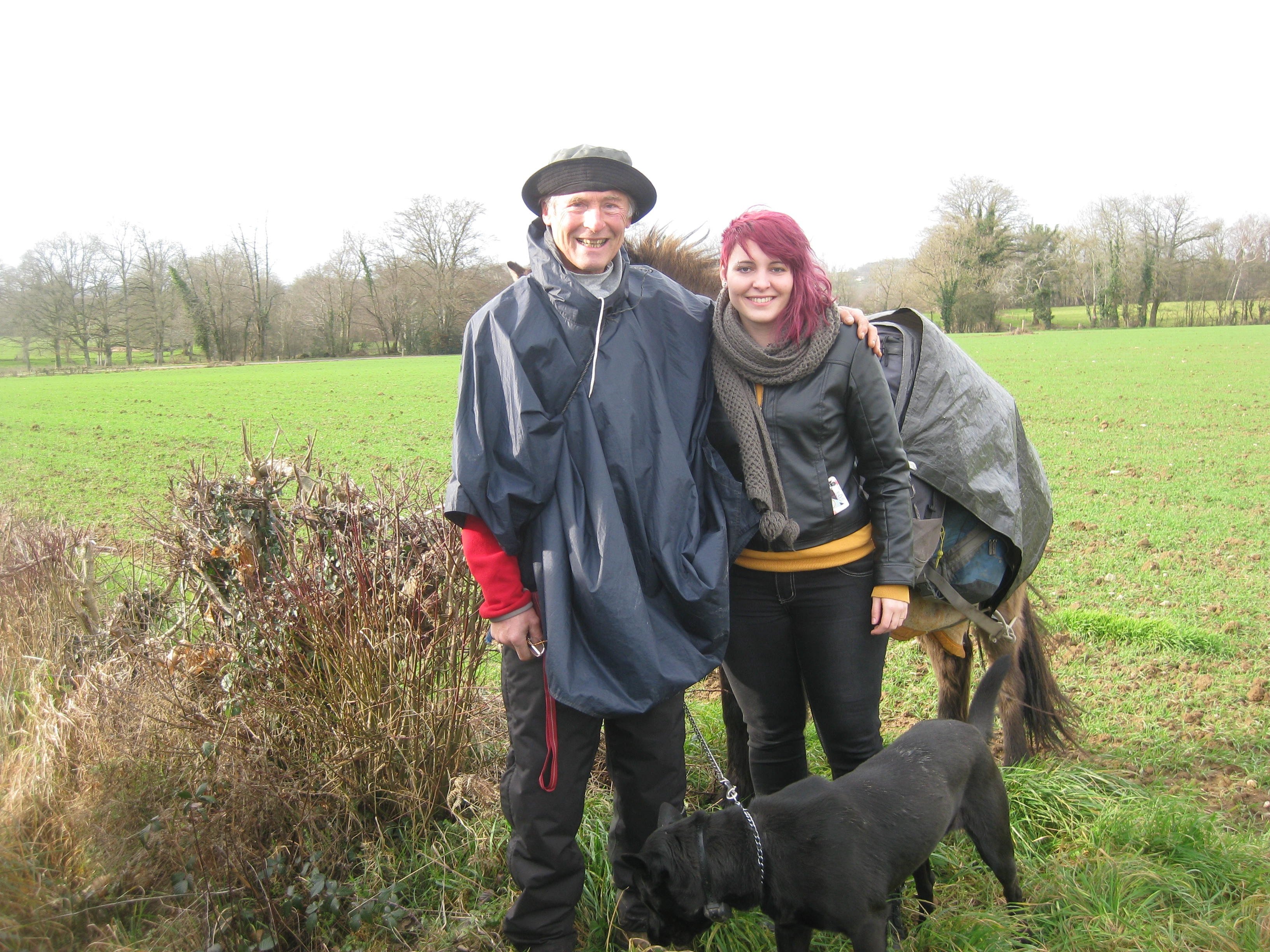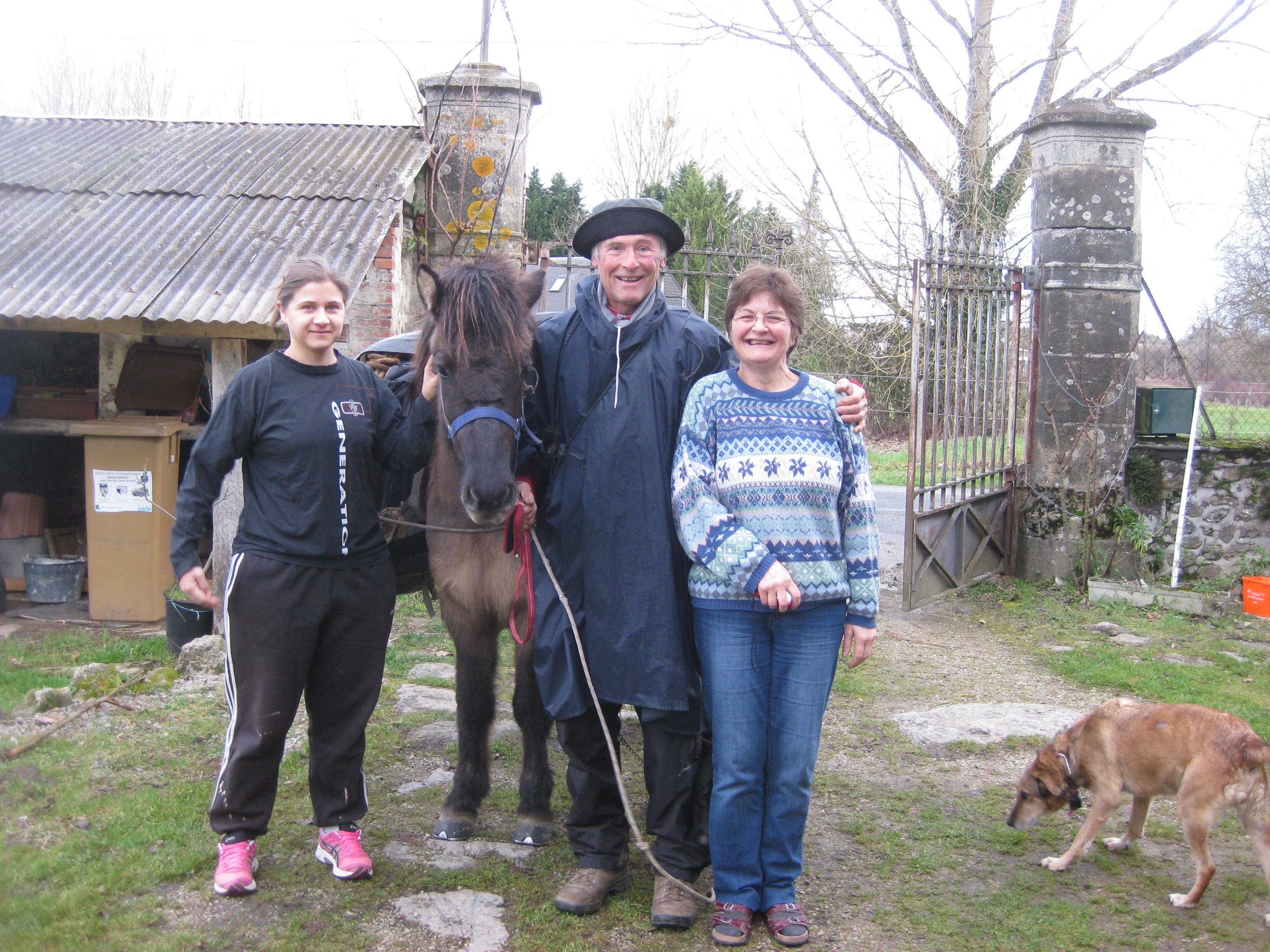 Intussen weer onderweg stopt opeens een auto: en, waar gaat de reis naar toe? (in het Frans dan). Ik maak Tosca en Leon even vast. Babbeltje midden op de weg met een man en zijn huwbare dochter. De vader vertelde over zijn andere dochter, die met een Nederlander is getrouwd en in Dordrecht woont. Nou, leuk, hoop ik. Weer verder. Na 10 min. komt dezelfde auto weer terug. Ik kom je een zakje krachtvoer brengen voor je paard, zei hij. Toch wel aardig, hè. Ik sleur zijn dochter uit de auto voor een foto met Leon en mij.