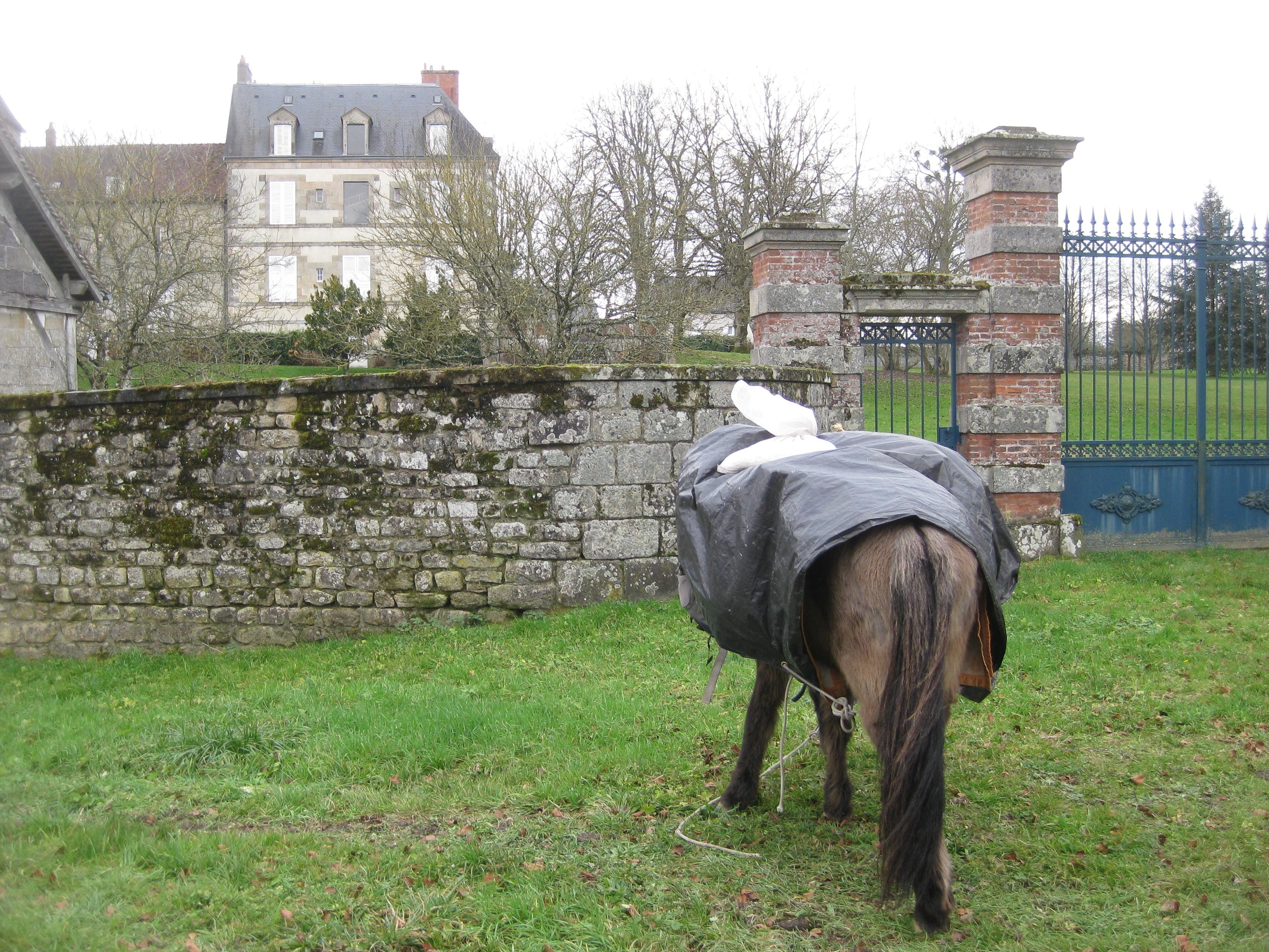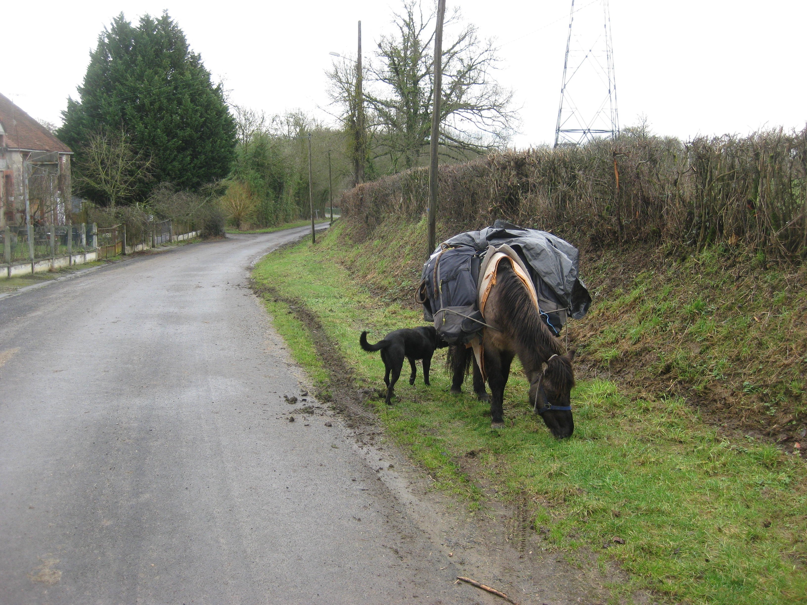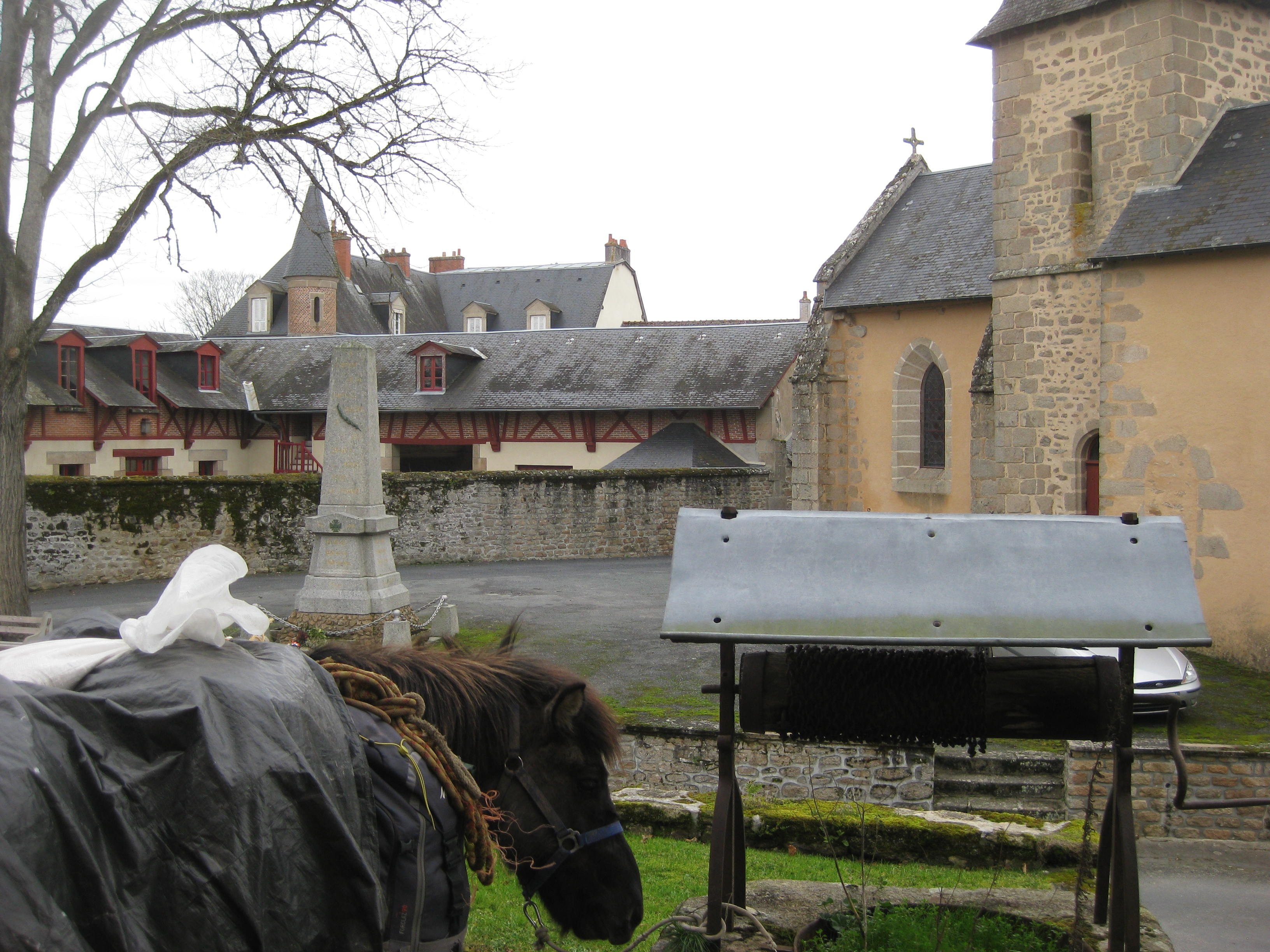 Het ging weer op en neer door deze mooie streek. Net zoals de vorige dagen constant over doodstille weggetjes, door prachtige gehuchtjes. Tosca liep merendeels los en, ondanks haar nacht buiten onder een afdak, rende ze weer onophoudelijk. Ik liep 29 km. Tosca heeft minstens 50 km. gelopen. Niet kapot te krijgen. Ik neem aan haar een voorbeeld en beeld me in: zo hond, zo baas. Broodschimmel maakt penicilline? In een prachtig dorpje, waarvan ik de naam niet meer ga opzoeken, want mijn boekjes zijn al ingepakt voor een spoedig vertrek morgenvroeg, dus in een mooi dorpje stond café ouvert. Het wordt toch al laat vandaag, dus een kwartier extra kan er ook nog wel bij. Kom ik daar in een huiskamer, die was ingericht als café, met een struise blonde dame met uitgesproken Engels accent. Ze bleek een Schotse, getrouwd met een Fransman. Oh, zeg ik, mijn schoonzus Lil is ook met een Fransman getrouwd. We hadden dus weer direct een hoop te ouwbetten, nu in het Engels. Hé, zegt ze, je paard loopt de straat uit. Nu kon dat in dit gehucht toch geen kwaad, maar ik stormde toch maar naar buiten om de verrekkeling weer vast te zetten. Ik kom zó terug om de koffie leeg te drinken, riep ik haar nog toe onder het naar buiten stormen, want ze dacht misschien dat ik ‘m smeerde vanwege de hoge prijs: 3 e per kop. Ik maakte een paar foto’s, o.a. van de inderdaad opvallend veel leien daken.
